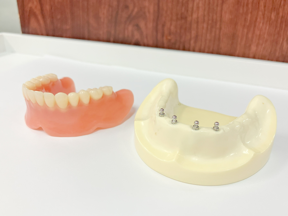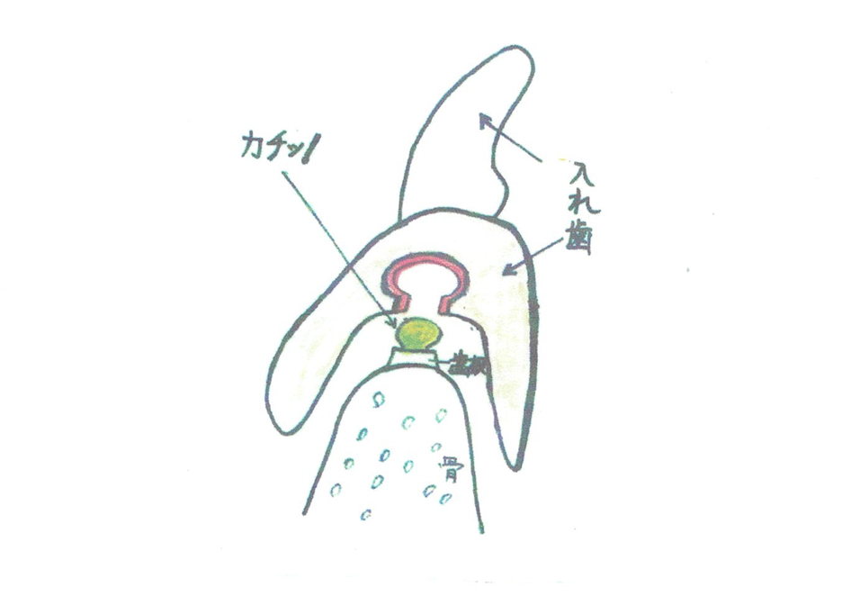 入れ歯が動かなくなる方法です。すでに入れ歯を使っている方で、歯の根が残っている場合、それにボールアタッチメント(維持装置)をはめ込むことで入れ歯が安定します。ホックのように入れ歯とネジがカチッとかみ合い、簡単に止めたり、外したりができます。